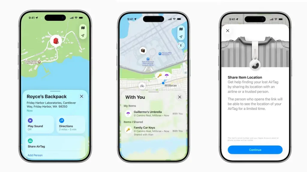- รองรับฟีเจอร์ Lost Mode เช่นเดิม พร้อมบริการสแกน NFC เพื่อหาข้อมูลเจ้าของสิ่งของที่หาย และสามารถแชร์ตำแหน่งกับผู้อื่นได้ อย่างสายบิน ในกรณีตามหากระเป๋าเดินทางที่มาถึงล่าช้าหรือสิ่งของที่สูญหายอื่นๆ Apple ได้เป็นพันธมิตรโดยตรงกับสายการบินกว่า 50 สายเพื่อยอมรับลิงก์ “แชร์ตำแหน่งที่ตั้งของสิ่งของ” โดยแชร์ตำแหน่งของสิ่งของที่สูญหายกับทีมบริการลูกค้าของสายการบินที่เป็นพันธมิตร ข้อมูลจาก SITA ซึ่งเป็นผู้ให้บริการด้าน IT สำหรับสายการบิน