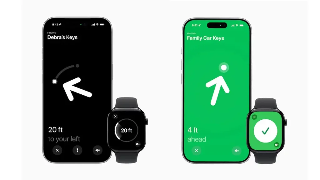 - มีการอัปเกรดชิปบลูทูธใหม่ ช่วยขยายระยะที่สามารถระบุตำแหน่งสิ่งของได้ ทำให้ฟีเจอร์ Precision Finding แต่เดิมใช้งานได้เฉพาะบน iPhone ตอนนี้สามารถใช้งานบน Apple Watch Series 9 ขึ้นไป หรือ Apple Watch Ultra 2 ขึ้นไป ได้ด้วย