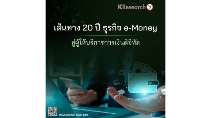 คงไม่มีใครคาดคิดว่า ธุรกิจ E-Money ในวันนี้ ได้เข้ามามีผลต่อพฤติกรรมในการใช้จ่ายของคนไทยยุคดิจิทัล ยุคที่ผู้คนไม่นิยมจากเงินสดเหมือนแต่ก่อน ซึ่ง กฤษฎิ์ แก้วหิรัญ นักวิจัยอาวุโส ศูนย์วิจัยกสิกรไทย ได้เขียนเส้นทางของธุรกิจ E-Money เอาไว้ทำให้เห็นภาพที่มาที่ไปและแนวโน้มที่จะเกิดขึ้นของธุรกิจ E-Money ได้อย่างชัดเจน