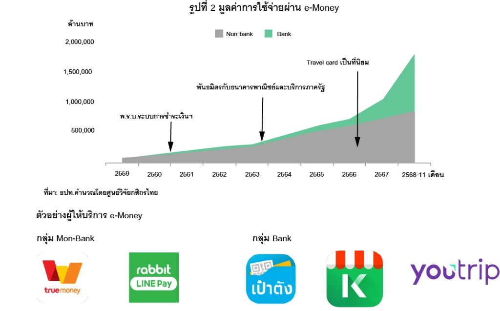 ปี 2568 มูลค่าการชำระเงินผ่าน e-money ยังคงเติบโตสูง โดยในช่วง ม.ค.-พ.ย.2568 ขยายตัวเกือบเท่าตัวจากช่วงเดียวกันปีก่อน โดยศูนย์วิจัยกสิกรไทยคาดว่าการชำระเงินผ่าน e-money จะมีมูลค่า 2 ล้านล้านบาท ตามแนวโน้มการเติบโตของผู้ให้บริการที่เป็นสถาบันการเงินที่มีผลิตภัณฑ์และแพลตฟอร์มที่หลากหลาย ขณะที่กลุ่ม Non-Bank ยังสามารถเติบโตได้จากการขยายเครือข่ายจุดชำระเงินและผลิตภัณฑ์ทางการเงินที่ให้บริการในแพลตฟอร์ม (รูปที่ 3)