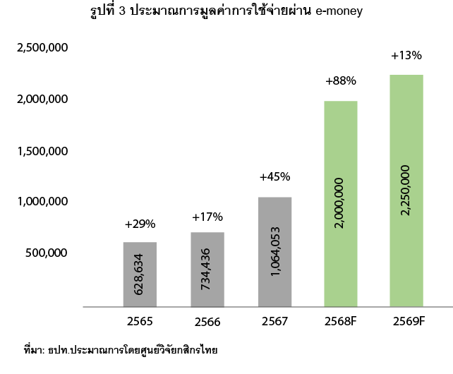 ปี 2569 ศูนย์วิจัยกสิกรไทยคาดมูลค่าการใช้จ่ายผ่าน e-money จะขยับขึ้นไปที่ 2.25 ล้านล้านบาท หรือขยายตัว 13% ชะลอลงจากที่คาดว่าอาจขยายตัว 88% ในปี 2568 โดยมองว่า แม้ e-money จะเป็นหนึ่งในตัวเลือกที่ผู้บริโภคหลายกลุ่มใช้ในการทำธุรกรรมชำระเงินรายย่อยผ่านช่องทางดิจิทัลภายใต้แนวโน้มการลดใช้เงินสด และการเชื่อมโยงกับผลิตภัณฑ์ทางการเงินรูปแบบใหม่ แต่อย่างไรก็ดี ธุรกรรมการชำระเงินด้วยเงินอิเล็กทรอนิกส์อาจเติบโตในกรอบจำกัด เพราะพฤติกรรมผู้บริโภคยังมีความคุ้นชินกับระบบ PromptPay ประกอบกับยังน่าจะมีการติดตามธุรกรรมต้องสงสัยเพื่อจัดการภัยทางการเงิน ขณะที่ การใช้จ่ายในปีนี้อาจชะลอลงตามทิศทางเศรษฐกิจไทยในภาพรวมด้วยเช่นกัน (รูปที่ 3)
