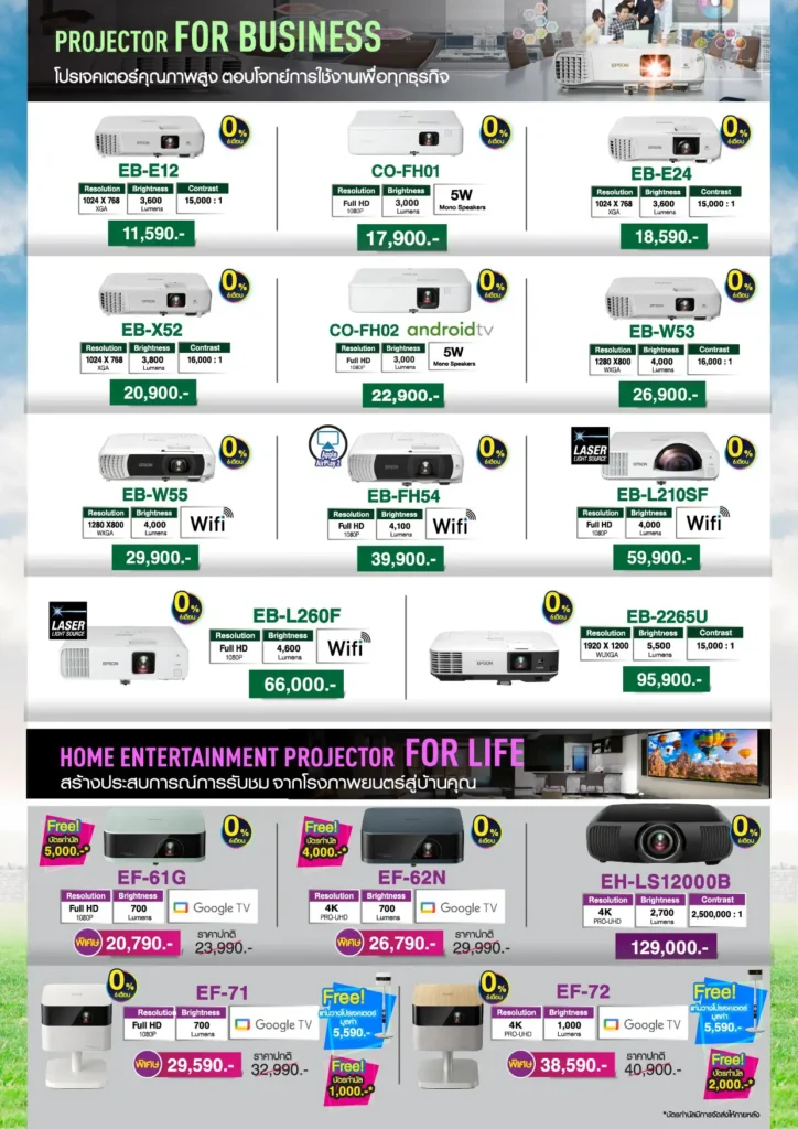 นอกจากนี้ เอปสันยังนำโปรเจคเตอร์หลากหลายรุ่นมาจัดแสดงพร้อมราคาพิเศษ ทั้งรุ่นสำหรับธุรกิจและการใช้งานภายในบ้าน เช่น EF-Series และ EB-Series รวมถึงโปรเจคเตอร์โฮมเธียเตอร์ระดับพรีเมียม พร้อมข้อเสนอผ่อนชำระ 0% นานสูงสุด 6 เดือน และโปรโมชั่นพิเศษภายในงาน
