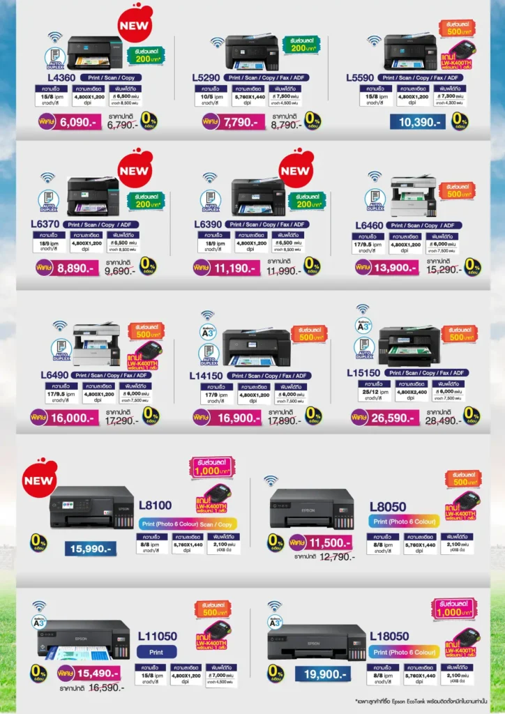 ภายในงาน เอปสันจัดโปรโมชั่นราคาพิเศษสำหรับเครื่องพิมพ์ยอดนิยมหลายรุ่น อาทิ EcoTank L121 ราคา 3,800 บาท L3210 ราคา 3,790 บาท L3250 ราคา 4,290 บาท และ L3550 ราคา 4,990 บาท พร้อมข้อเสนอผ่อนชำระ 0% นานสูงสุด 6 เดือน
