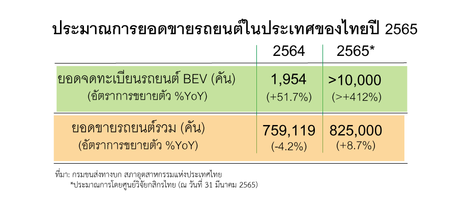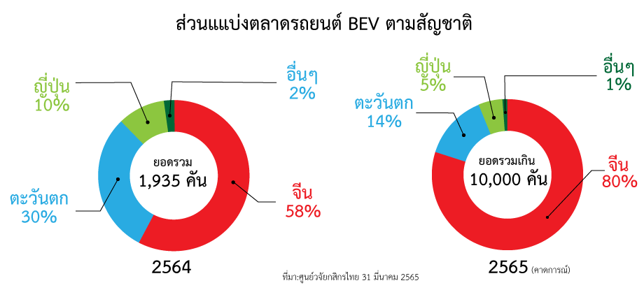 ศูนย์วิจัยกสิกรไทยได้คาดการณ์ว่า ปี 2565 นี้ รถยนต์ไฟฟ้า (EV) สัญชาติจีน จะมีโอกาสสร้างส่วนแบ่งตลาดเพิ่มขึ้นจาก 58% ของยอดขายรถยนต์ไฟฟ้า รวมในปีที่แล้วขึ้นเป็นกว่า 80% ในปีนี้ จากยอดขายรถยนต์ไฟฟ้ารวมที่คาดว่าจะมีมากกว่า 10,000 คัน ขยายตัวมากกว่า 412.0%(YoY) หลังปีที่แล้วจดทะเบียนกับกรมการขนส่งทางบกที่ 1,954 คัน