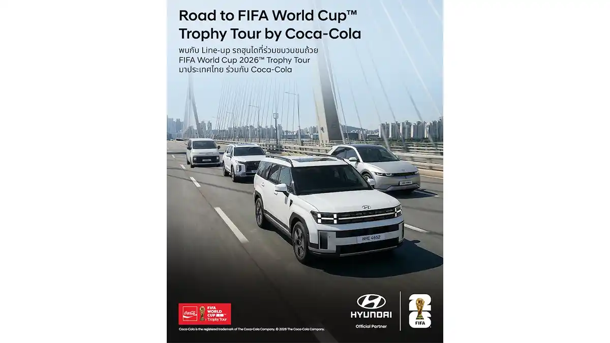 กระแสฟุตบอลโลกเริ่มอุ่นเครื่องก่อนศึกใหญ่จะเปิดฉากอย่างเป็นทางการ เมื่อ ฮุนได จับมือกับ “โคคา-โคล่า” จุดประกายความคลั่งไคล้ลูกหนังในประเทศไทย ผ่านกิจกรรมระดับโลก FIFA World Cup 2026™ Trophy Tour by Coca-Cola นำถ้วยแห่งประวัติศาสตร์อันทรงคุณค่าและยิ่งใหญ่ที่สุดในวงการฟุตบอลอย่าง FIFA World Cup™ Trophy เดินทางมาให้แฟนบอลชาวไทยได้สัมผัสของจริงแบบใกล้ชิด