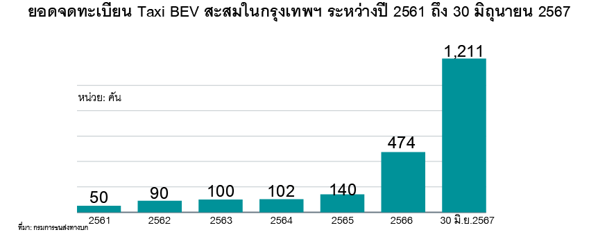 บทวิเคราะห์ของศูนย์วิจัยกสิกรไทยมองว่า ตลาดรถแท็กซี่ไฟฟ้า (Taxi BEV) เติบโตขึ้นทุกขณะ โดยปี 2567 นี้ ส่วนแบ่งน่าจะสามารถพุ่งไปอยู่ที่ 49% ของยอดจดทะเบียนแท็กซี่ใหม่ทั้งตลาด ที่คาดว่า จะมี 3,300 คันได้