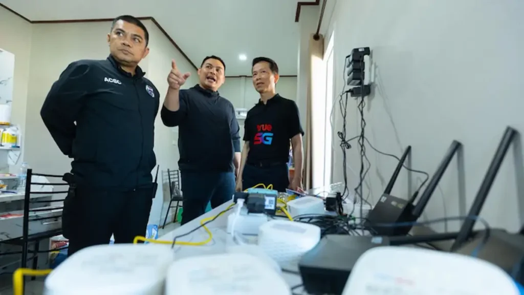 พ.ต.ท.ตฤณ ลีลานุช สารวัตรกลุ่มงานสนับสนุน คดีเทคโนโลยี บก.ปอท. สอบสวนกลาง กล่าวว่า จากความร่วมมือกับทรู และผู้ให้บริการรายอื่นในการปราบปรามมิจฉาชีพออนไลน์ พบว่ามีห้องหนึ่งที่เช่าอะพาร์ตเมนต์ อ.แม่สาย จ.เชียงราย ติดกับชายแดน มีการใช้งานอินเทอร์เน็ตที่สูงผิดปกติ จึงได้ดำเนินการสอบสวน และเฝ้าติดตาม จนมั่นใจได้ว่ามีการใช้งานในทางผิดกฎหมาย และพบจุดน่าสงสัยอื่นๆ เช่นผู้เช่าห้องเคยมีความผิดทางคดีต่างๆ และสืบต่อในทางลับ จึงได้ขอหมายศาลในการตรวจค้นห้องดังกล่าว พบว่ามีการลักลอบใช้อุปกรณ์ผิดกฎหมายส่งสัญญาณอินเทอร์เน็ตข้ามแดนไปทางเมียนมา และร่วมมือกับทรูและผู้ให้บริการรายอื่นตัดวงจรให้บริการทันที และยึดอุปกรณ์ที่ผิดกฎหมาย พร้อมทั้งติดตามคนร้ายให้ได้โดยไวเพื่อนำตัวมาดำเนินคดีต่อไป